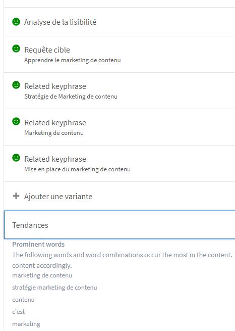 Si Yoast SEO est un excellent plugin, il ne contribue pas à l’analyse des mots-clés ou des écrits, encore moins à leur pertinence en considération des attentes de l’internaute, ou à leur valeur ajoutée par rapport aux sites concurrents. Par contre, il permet de savoir si le mot-clé principal est clairement mis en évidence dans un contenu. Il établit cette analyse sur la base d’une « checklist » intégrant :
